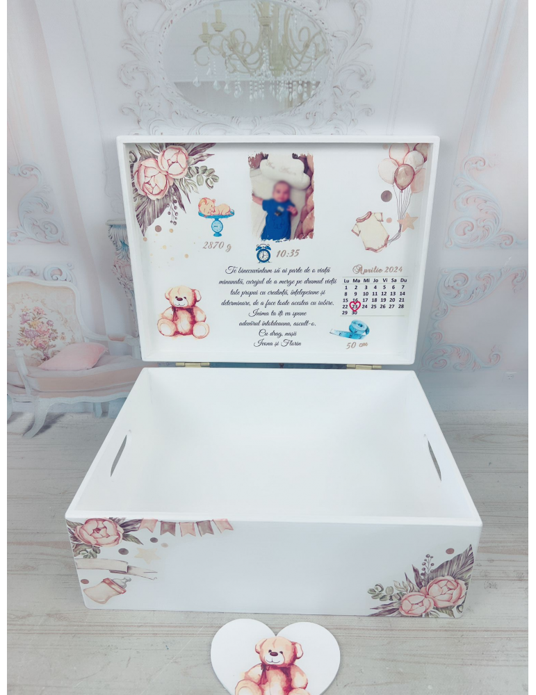 Pretul afisat se refera la o singura cutie de amintiri din lemn (fara alte accesorii) si include personalizarea acesteia cu datele copilului de la nastere. - Dimensiuni cutie de amintiri