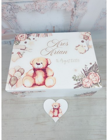 Cutie amintiri din lemn pentru botez cu ursulet nuante bej