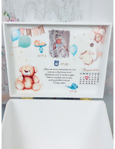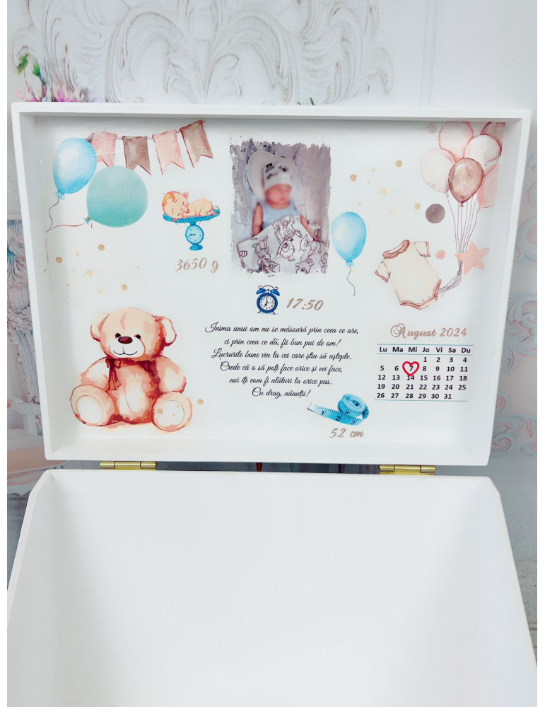 Pretul afisat se refera la o singura cutie de amintiri din lemn (fara alte accesorii) si include personalizarea acesteia cu datele copilului de la nastere. - Dimensiuni cutie de amintiri
