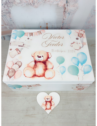 Cutie amintiri din lemn personalizata cu ursulet si baloane
