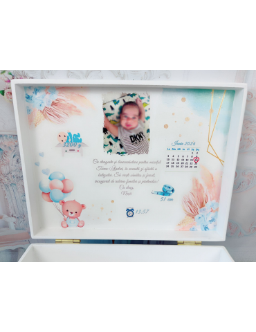 Pretul afisat se refera la o singura cutie de amintiri din lemn (fara alte accesorii) si include personalizarea acesteia cu datele copilului de la nastere. - Dimensiuni cutie de amintiri