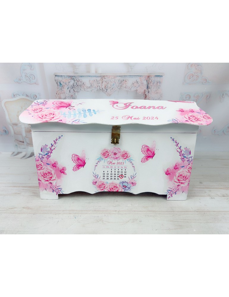 Transformă evenimentul special al botezului într-o experiență memorabilă cu această cutie de dar pentru botez, elegantă și personalizată. Cutia de dar pentru botez este realizată din lemn de înaltă calitate, fiecare produs fiind vopsit, lăcuit și finisat manual în atelierul nostru. Grafica delicată este adaptată special și transferată prin tehnica decoupage, oferindu-i un design unic și rafinat. Pentru o durabilitate de lungă durată, cutia este sigilată cu 3 straturi de lac, asigurând rezistența în timp.