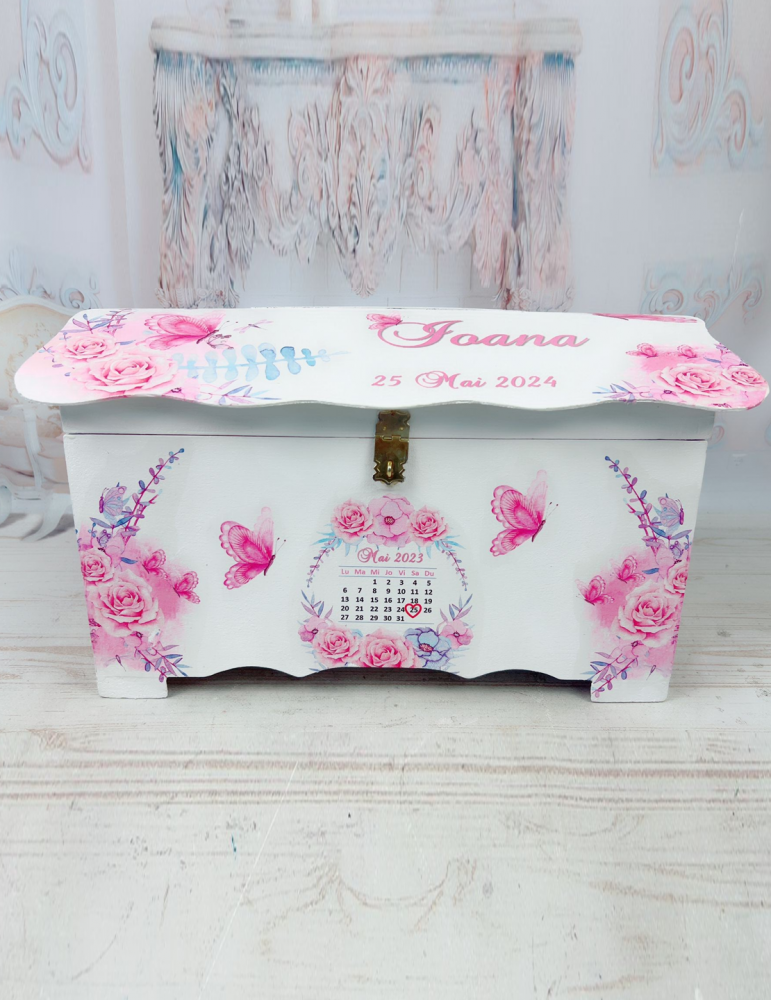 Eleganța și funcționalitatea se îmbină perfect în această cutie de dar pentru botez, realizată special pentru evenimente memorabile – botez magic de neuitat. Construită din lemn rezistent, vopsită și lăcuită manual, fiecare piesă este lucrată cu atenție la detalii. Designul transferat prin tehnica decoupage, oferă un aspect delicat și rafinat, iar straturile de lac protector asigură o durată de viață îndelungată.