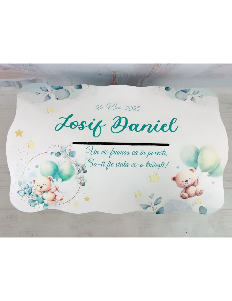 Cutia de dar pentru botez este perfectă pentru ca invitații să lase darurile destinate micuțului botezat într-un mod elegant și organizat.
