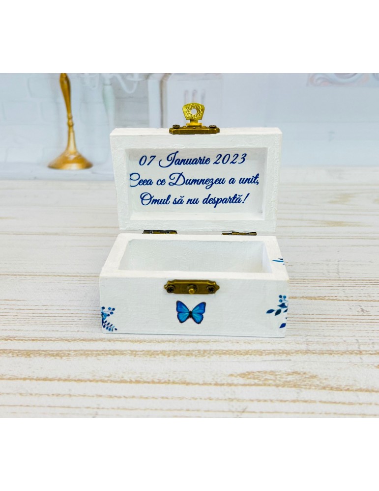 Pretul afisat se refera la o singura cutiuta de verighete si include personalizarea (inlocuire nume miri, data eveniment, mesaj preferat).