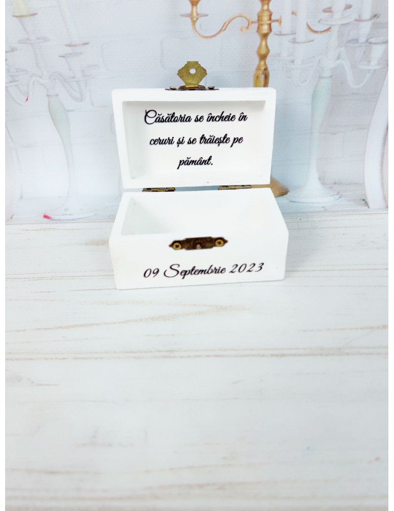 Nunta este un eveniment în care fiecare detaliu contează, iar cand alegi o cutie verighete personalizata adaugă un strop de unicitate și eleganță. Optați pentru o cutie pentru verighete care să rezoneze cu stilul și personalitatea miresei, fie că este vorba de o cutie verighete lemn pentru o notă rustică sau o cutie verighete catifea pentru un touch sofisticat. Cutie verighete nunta nu este doar un recipient, ci un simbol al dragostei și al angajamentului vostru.