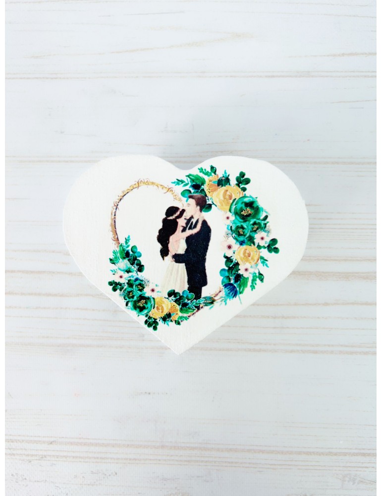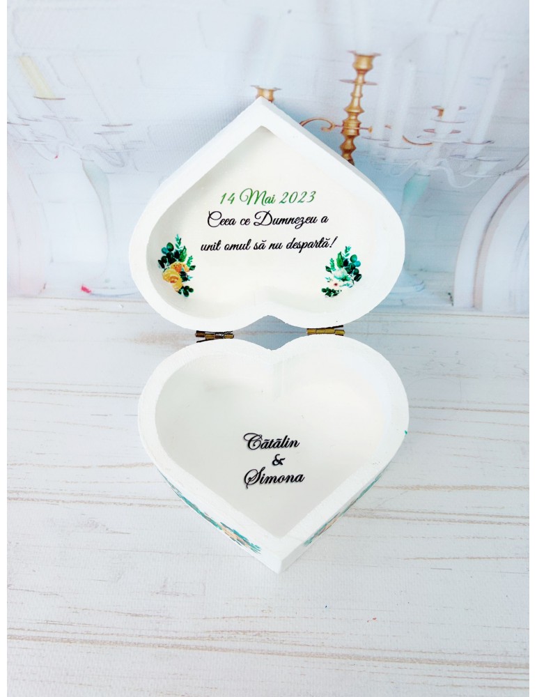 Pretul afisat se refera la o singura cutiuta de verighete si include personalizarea (inlocuire nume miri, data eveniment, mesaj preferat).