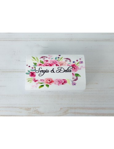 Pretul afisat se refera la o singura cutiuta de verighete si include personalizarea (inlocuire nume miri, data eveniment, mesaj preferat).