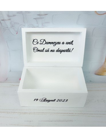 Nunta este un eveniment în care fiecare detaliu contează, iar cand alegi o cutie verighete personalizata adaugă un strop de unicitate și eleganță. Optați pentru o cutie pentru verighete care să rezoneze cu stilul și personalitatea miresei, fie că este vorba de o cutie verighete lemn pentru o notă rustică sau o cutie verighete catifea pentru un touch sofisticat. Cutie verighete nunta nu este doar un recipient, ci un simbol al dragostei și al angajamentului vostru.