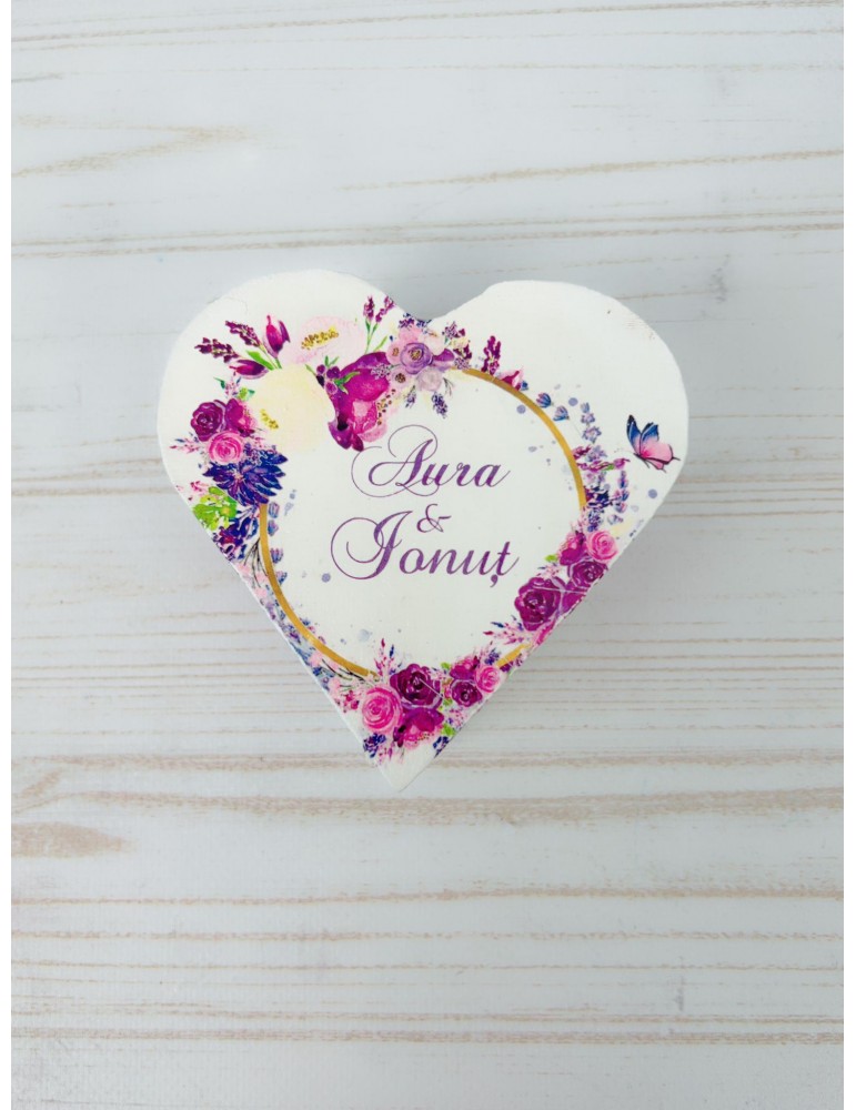 Pretul afisat se refera la o singura cutiuta de verighete si include personalizarea (inlocuire nume miri, data eveniment, mesaj preferat).
