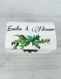 Pretul se refera la o singura cutie de verighete si include personalizarea cu numele mirilor, data evenimentului si mesajul preferat
