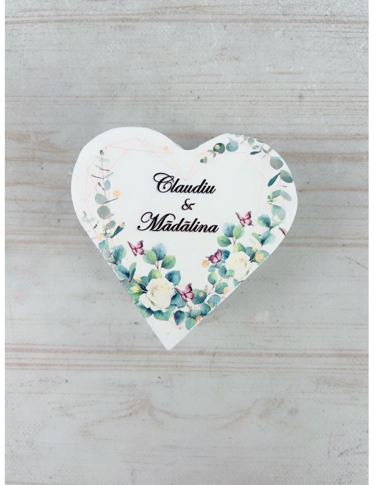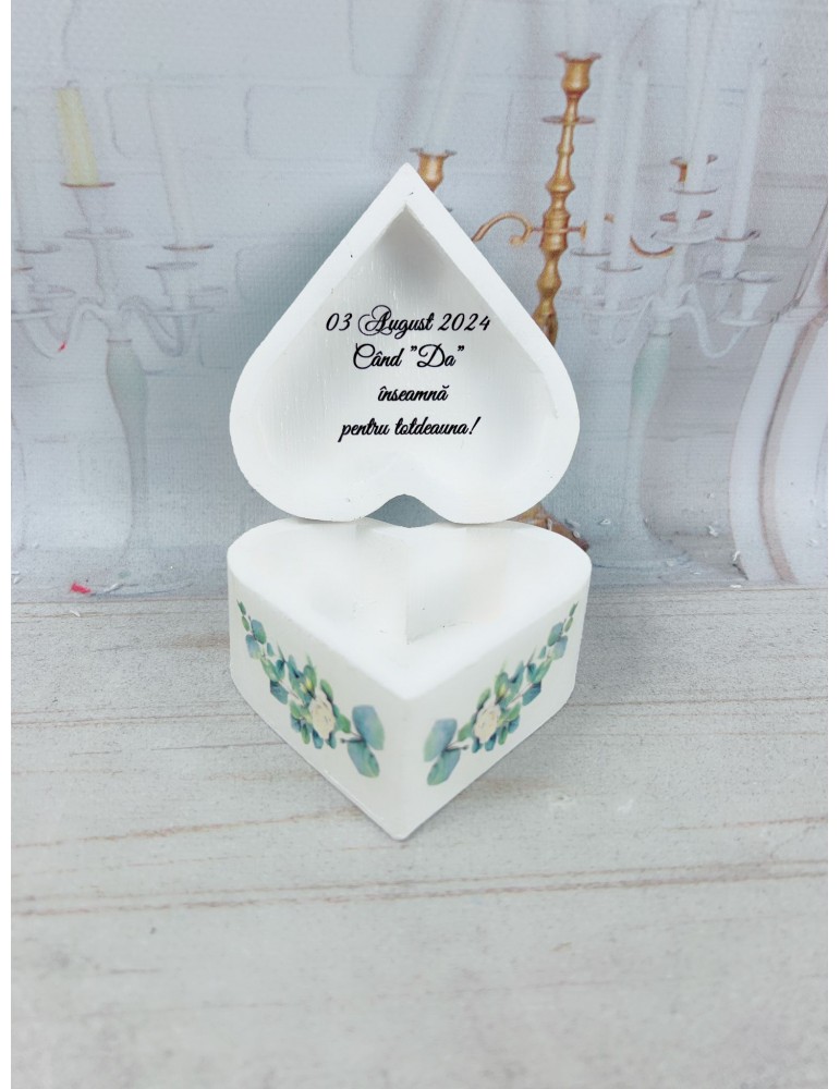 Pretul afisat se refera la o singura cutiuta de verighete si include personalizarea (inlocuire nume miri, data eveniment, mesaj preferat).