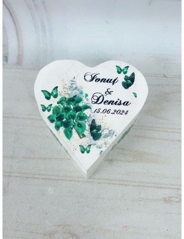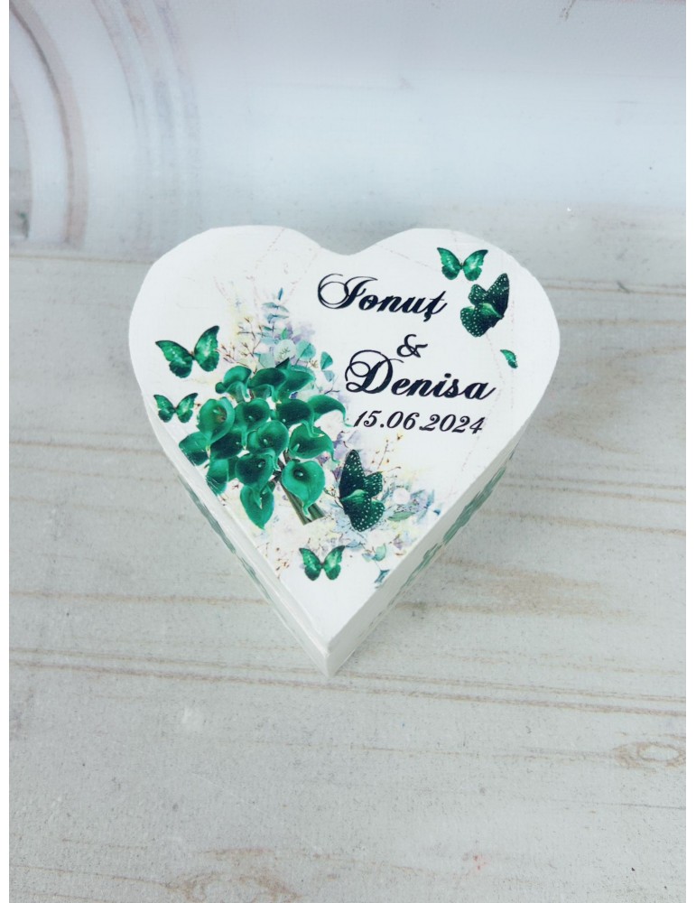 Pretul afisat se refera la o singura cutiuta de verighete si include personalizarea (inlocuire nume miri, data eveniment, mesaj preferat).