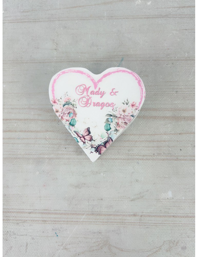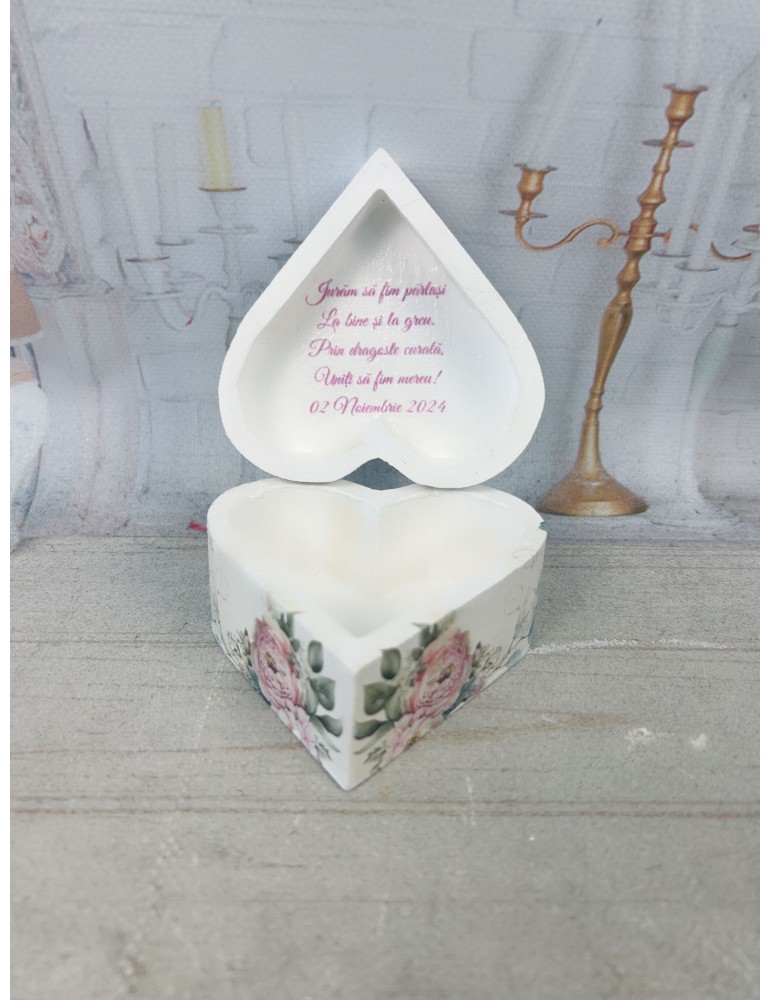 Pretul afisat se refera la o singura cutiuta de verighete si include personalizarea (inlocuire nume miri, data eveniment, mesaj preferat).