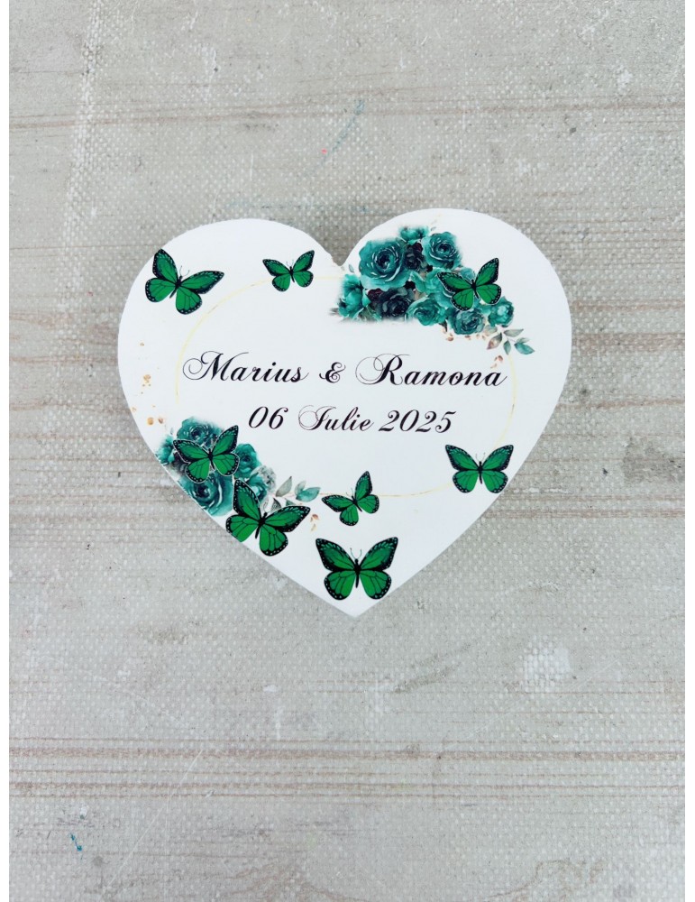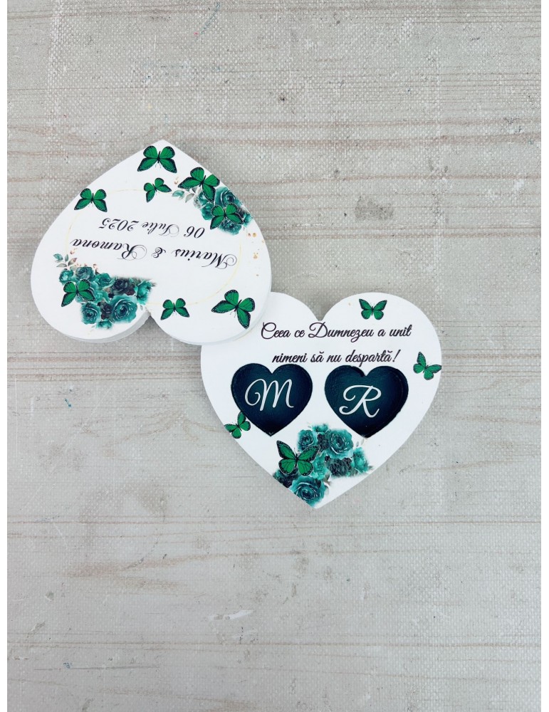 Pretul afisat se refera la o singura cutiuta de verighete si include personalizarea (inlocuire nume miri, data eveniment, mesaj preferat).