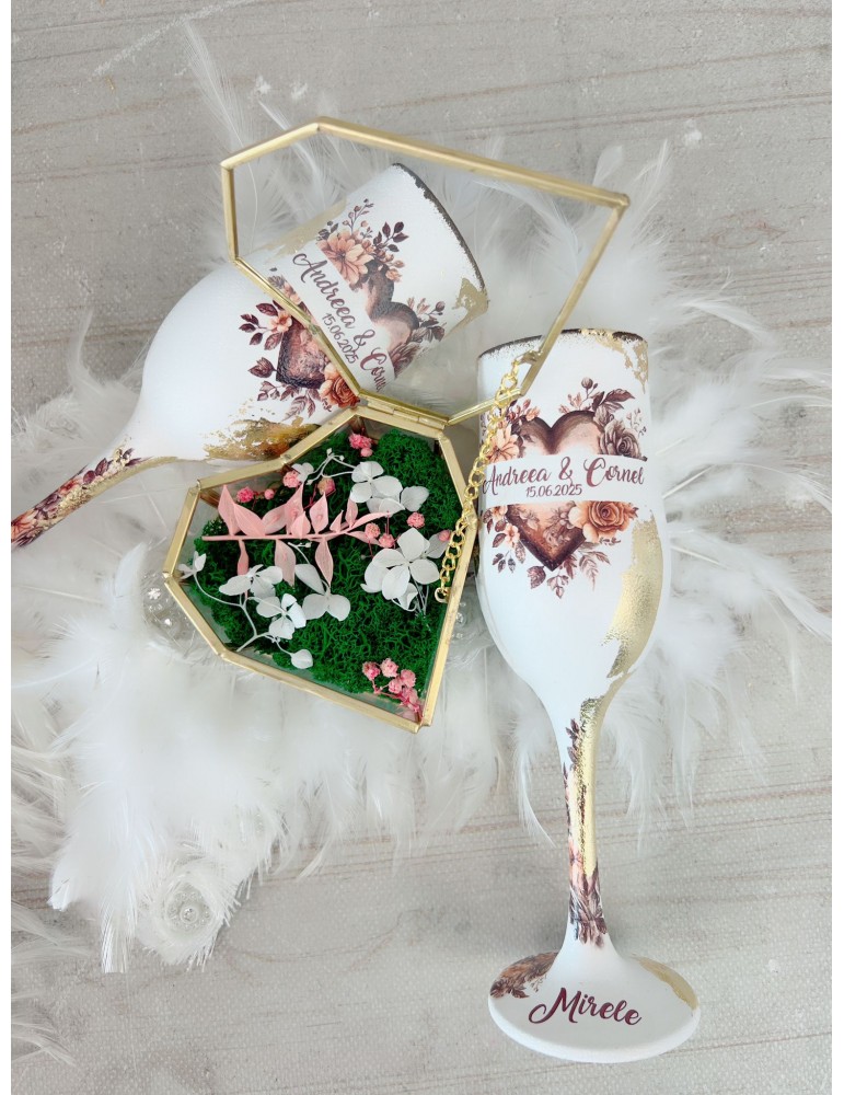 Pretul afisat se refera la o singura cutiuta de verighete si include personalizarea (adaugare nume miri, data eveniment).