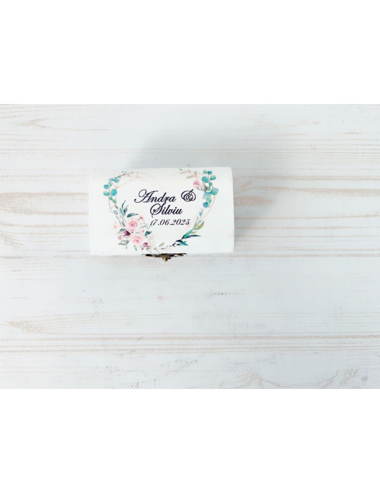 Pretul afisat se refera la o singura cutiuta de verighete si include personalizarea (inlocuire nume miri, data eveniment, mesaj preferat).