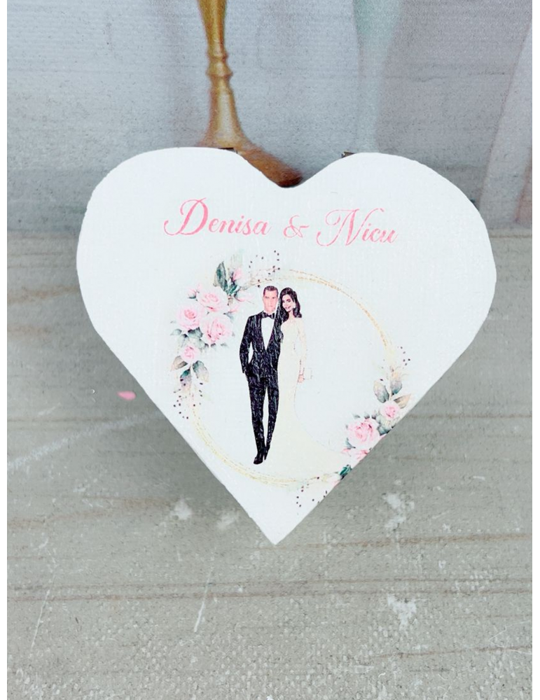 Pretul afisat se refera la o singura cutiuta de verighete si include personalizarea (inlocuire nume miri, data eveniment, mesaj preferat).