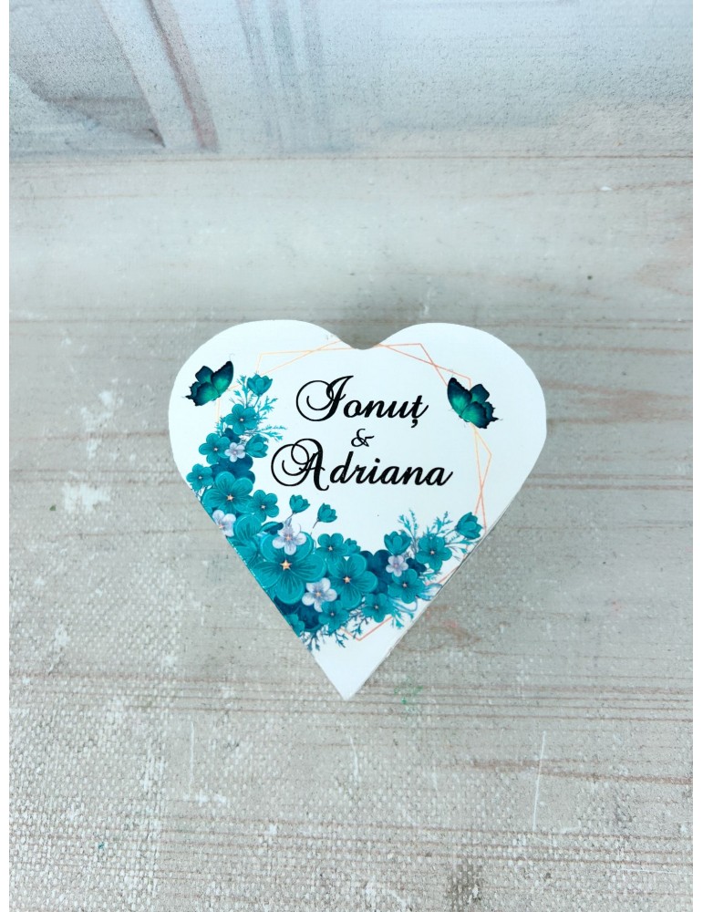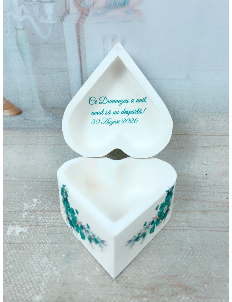 Pretul afisat se refera la o singura cutiuta de verighete si include personalizarea (inlocuire nume miri, data eveniment, mesaj preferat).