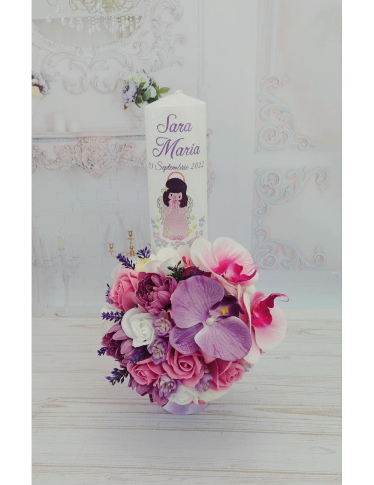 Personalizarea acestei lumânări de botez este flexibilă și complet adaptabilă cerințelor tale. Poți adăuga numele copilului, data evenimentului și orice tematică dorită, pentru a reflecta perfect stilul și unicitatea botezului. Florile artificiale (din materiale textile și/sau pastă de săpun) sunt alese cu grijă și asortate armonios cu tematica graficii, iar panglicile sunt selectate pentru a completa designul cu eleganță.