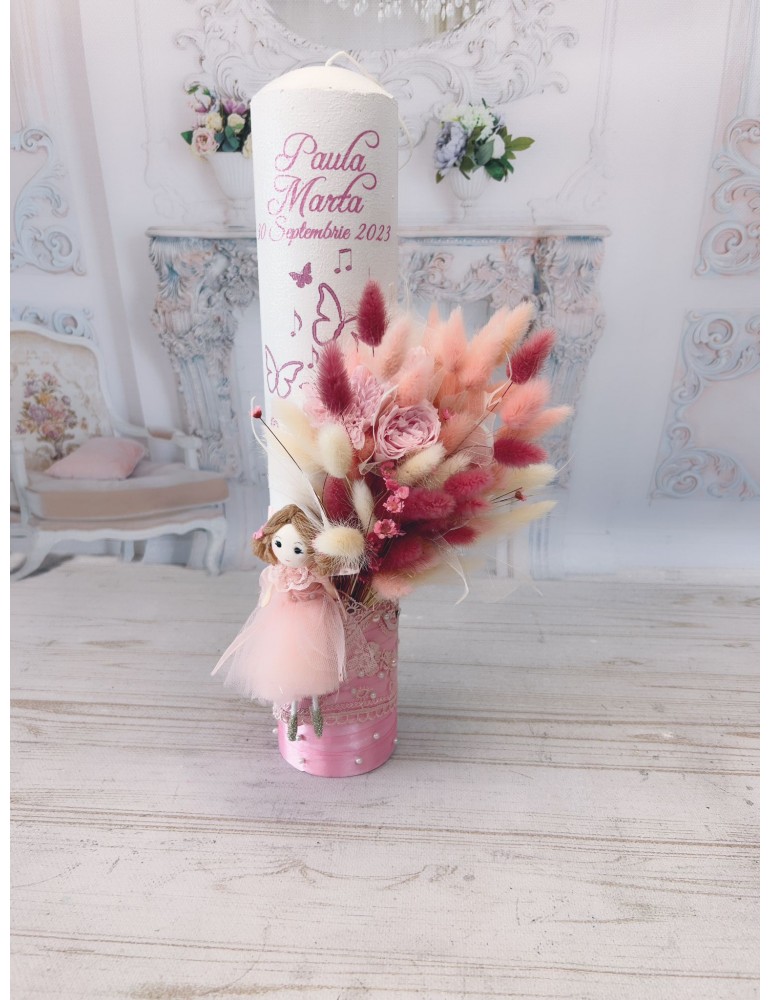 Personalizarea acestei lumânări de botez este flexibilă și complet adaptabilă cerințelor tale. Poți adăuga numele copiluluidata evenimentului și orice tematică dorită, pentru a reflecta perfect stilul și unicitatea botezului. Florile naturale, uscate sunt alese cu grijă și asortate armonios cu tematica graficii, iar panglicile sunt selectate pentru a completa designul cu eleganță.