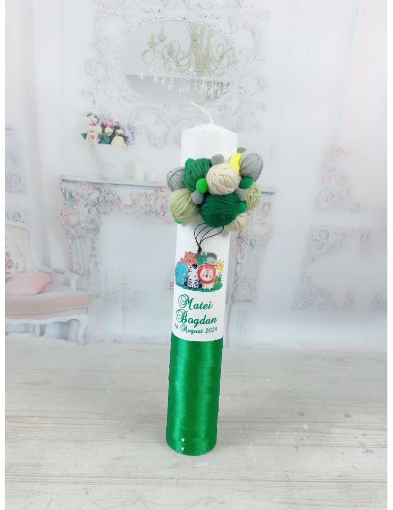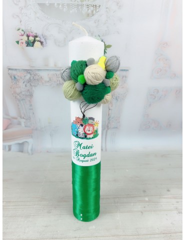 Personalizarea acestei lumânări de botez este flexibilă și complet adaptabilă cerințelor tale. Poți adăuga numele copilului, data evenimentului și orice tematică dorită, pentru a reflecta perfect stilul și unicitatea botezului. Ghemele sunt alese cu grijă și asortate armonios cu tematica graficii, iar panglicile sunt selectate pentru a completa designul cu eleganță.