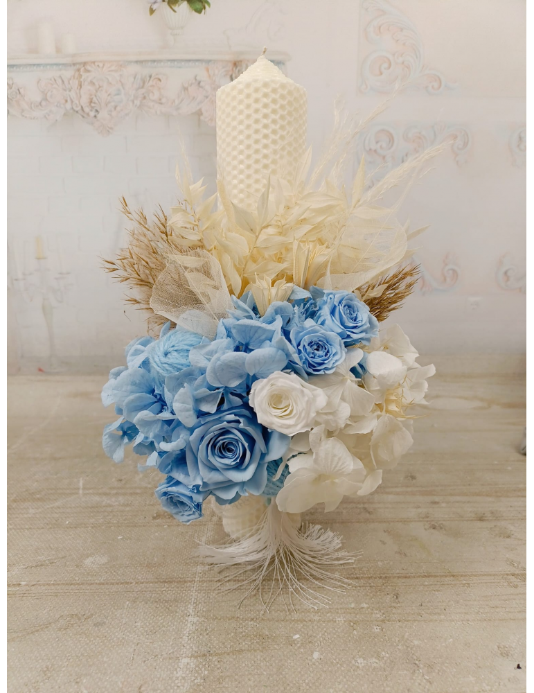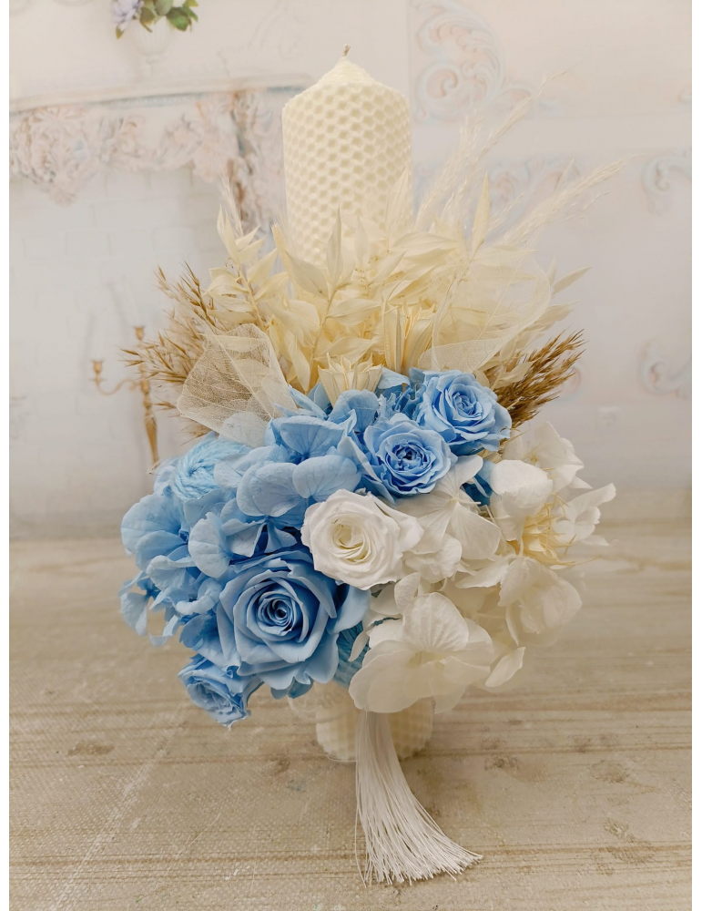 Personalizarea acestei lumânări de botez este flexibilă și complet adaptabilă cerințelor tale. Poți adăuga numele copilului, data evenimentului și orice tematică dorită, pentru a reflecta perfect stilul și unicitatea botezului. Florile naturale, uscate sunt alese cu grijă și asortate armonios cu tematica graficii, iar panglicile sunt selectate pentru a completa designul cu eleganță.