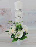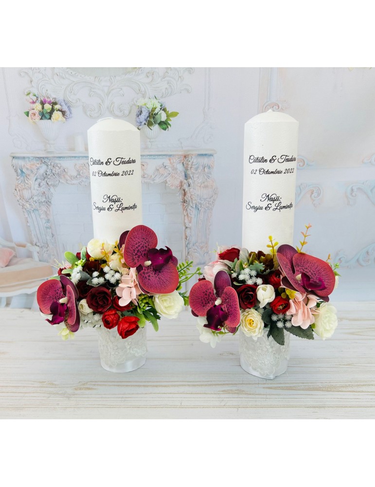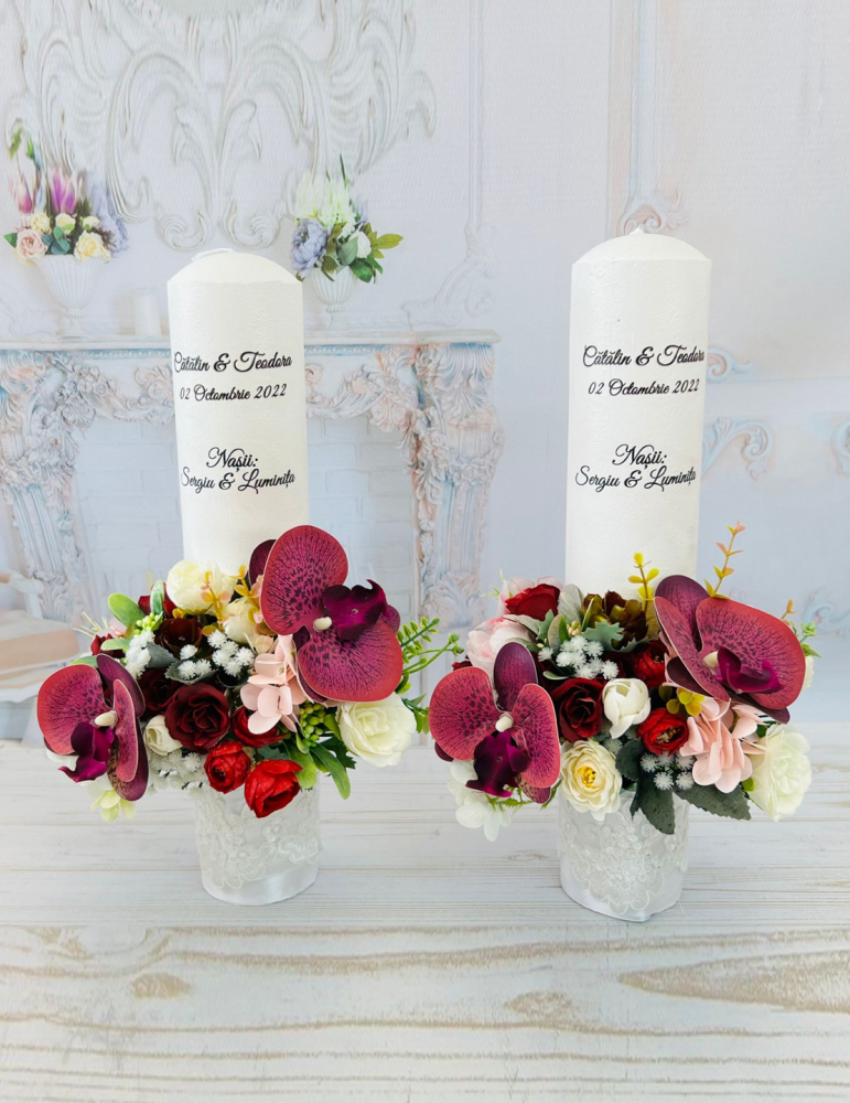 ATENTIE: florile utilizate pentru aranjamentul lumanarilor sunt flori artificiale/textile, NU sunt flori naturale.