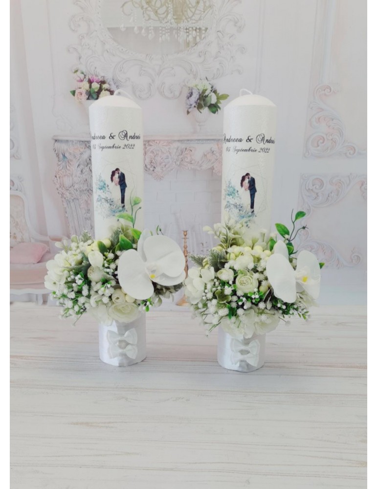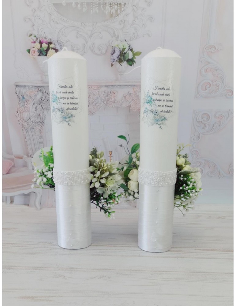ATENTIE: florile utilizate pentru aranjamentul lumanarilor sunt flori artificiale/textile, NU sunt flori naturale.