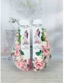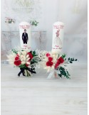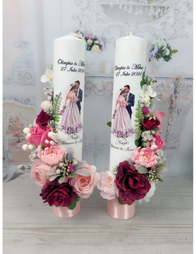 Lumanari nunta personalizate cu flori roz alb si burgundy