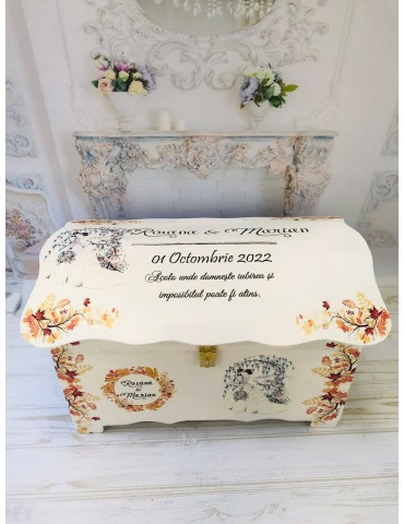 Pretul afisat se refera la o singura cutie de dar pentru nunta si include personalizarea (inlocuire nume miri, data eveniment si mesaj preferat).