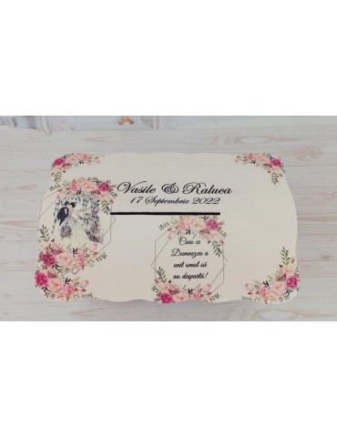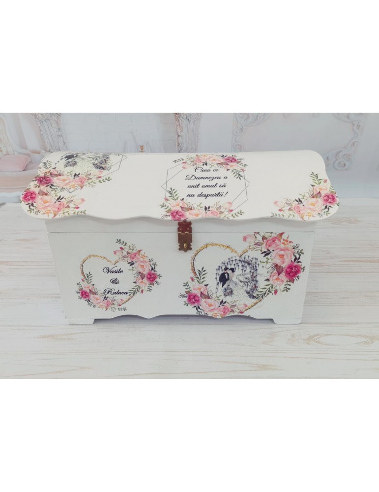 Pretul afisat se refera la o singura cutie de dar pentru nunta si include personalizarea (inlocuire nume miri, data eveniment si mesaj preferat).