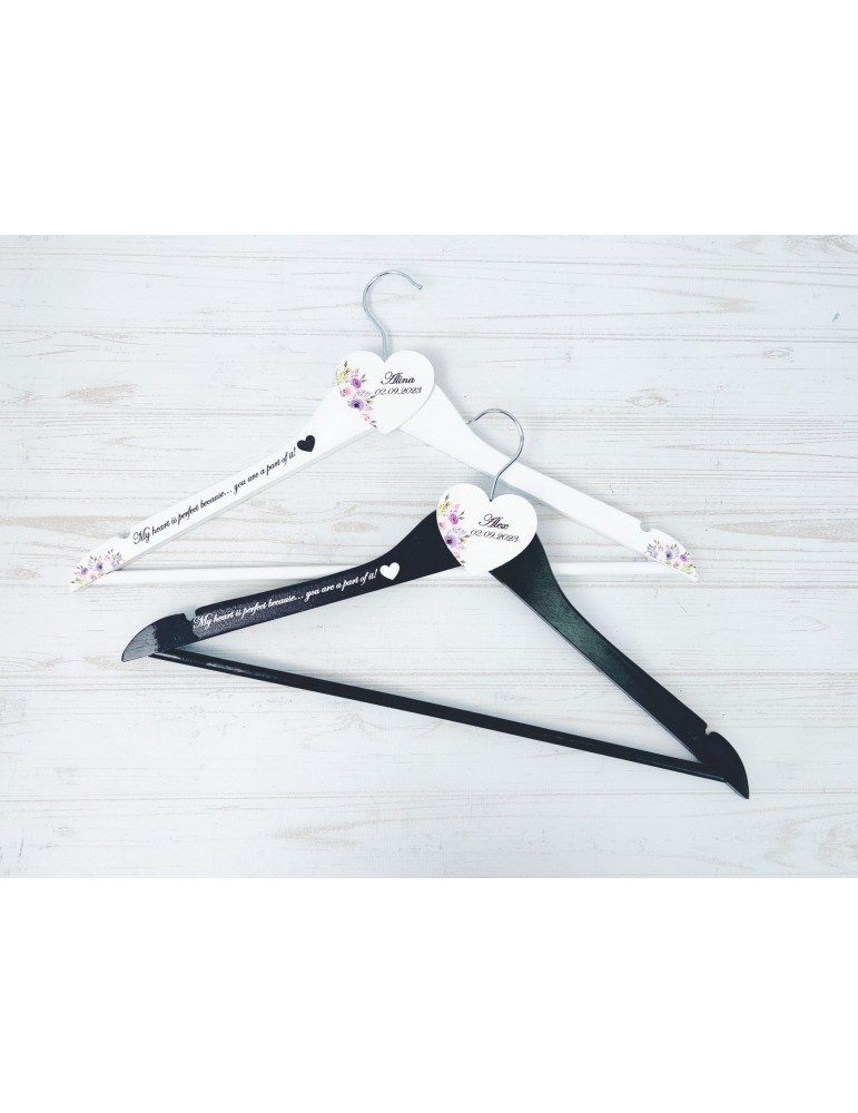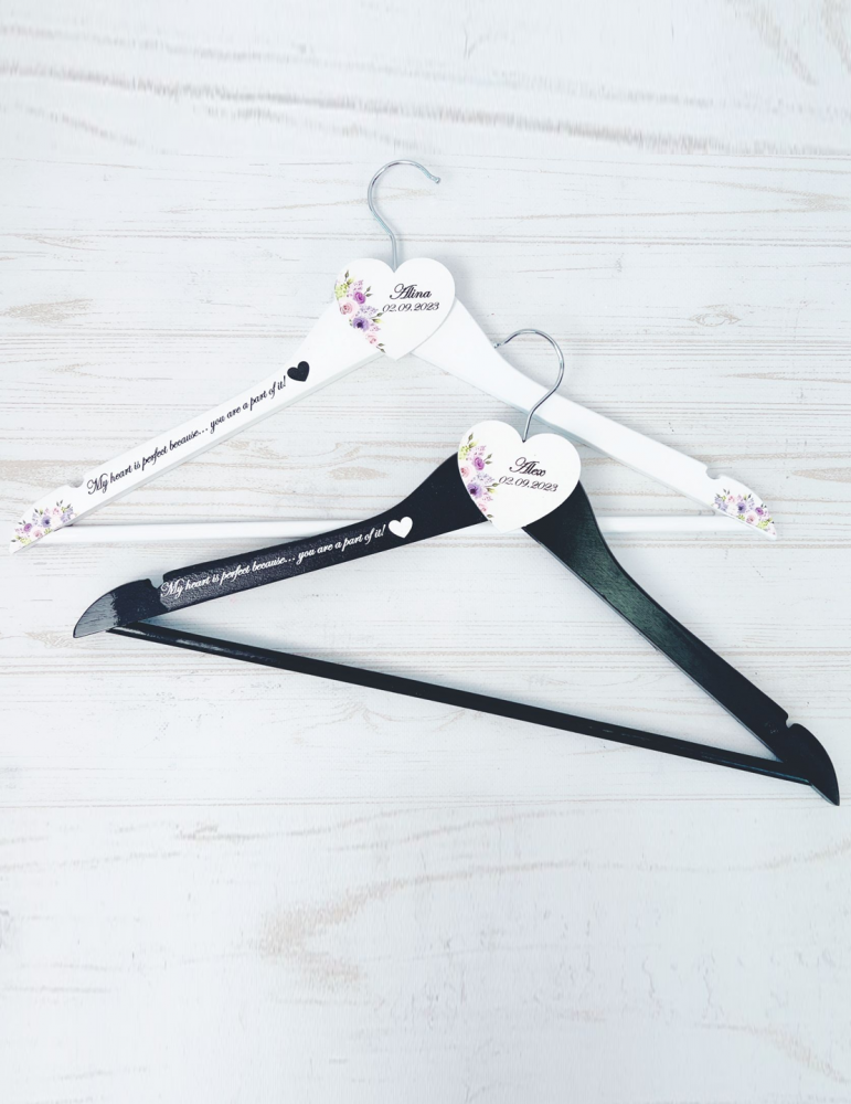 Un set de umerase personalizate cu tematica nuntii este cel mai frumos suport pe care hainele de nunta pot fi asezate cu eleganta.