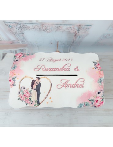 Pretul afisat se refera la o singura cutie de dar pentru nunta si include personalizarea (inlocuire nume miri, data eveniment si mesaj preferat).