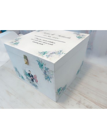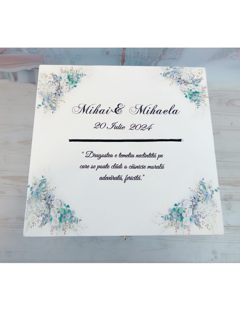 Pretul afisat se refera la o singura cutie de dar pentru nunta si include personalizarea (inlocuire nume miri, data eveniment si mesaj preferat).