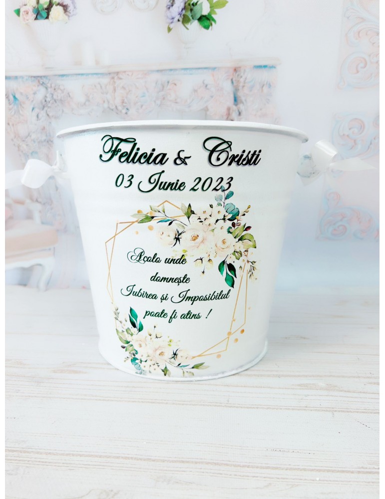 Pentru mireasa care își dorește să îmbine tradiția cu un strop de creativitate, galeata pentru mireasa este un accesoriu esențial în ziua nunții. Ideală pentru a fi folosită în cadrul ceremoniei de aruncare a buchetului sau ca parte din decorul pentru ședința foto, această găleată adaugă un element surpriză și personalizat evenimentului tău special.