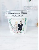 Pretul este pentru o singura galeata si include personalizarea cu numele mirilor, data evenimentului si citatul preferat.