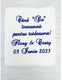 Pretul este pentru un singur prosop ginere si include personalizarea cu numele mirilor, data evenimentului si citatul preferat.