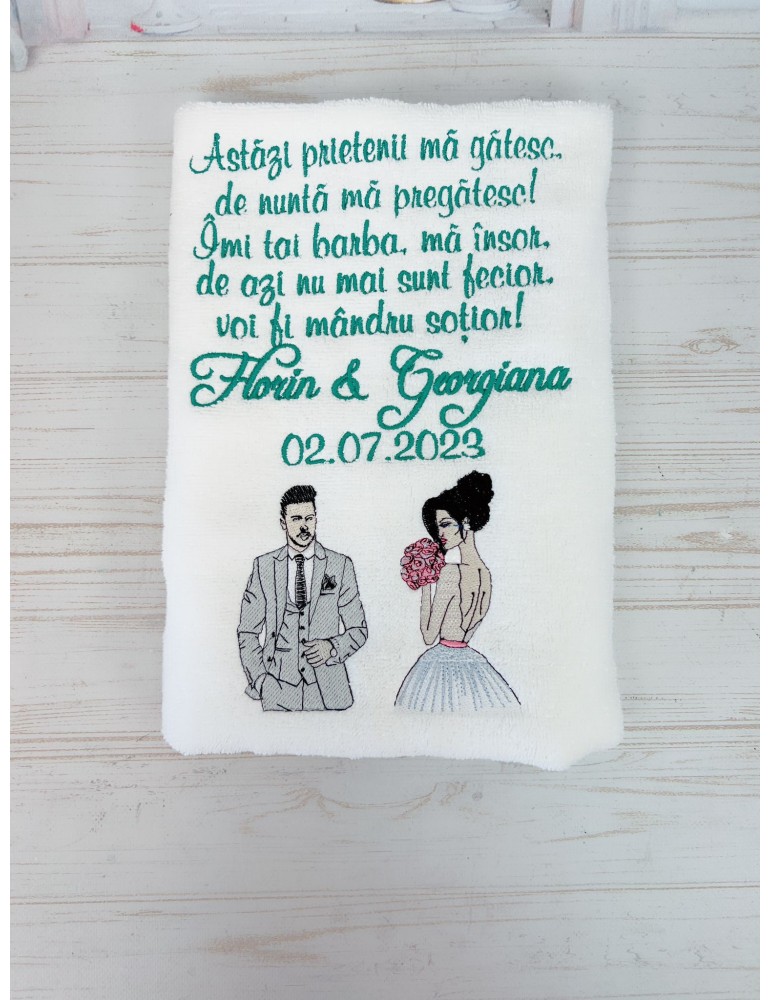 Pretul este pentru un singur prosop ginere si include personalizarea cu numele mirilor, data evenimentului si citatul preferat.