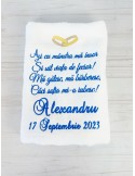 Pretul este pentru un singur prosop ginere si include personalizarea cu numele mirilor, data evenimentului si citatul preferat.