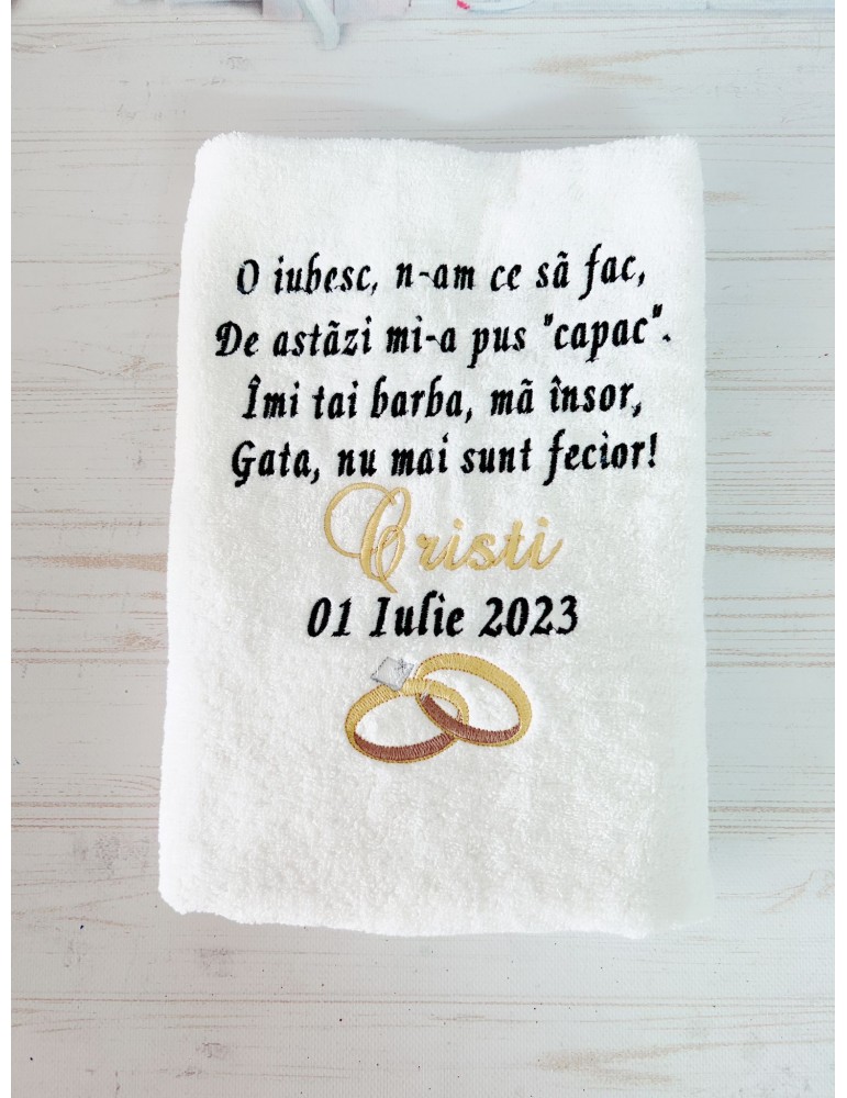 Pretul este pentru un singur prosop ginere si include personalizarea cu numele mirilor, data evenimentului si citatul preferat.