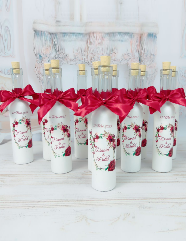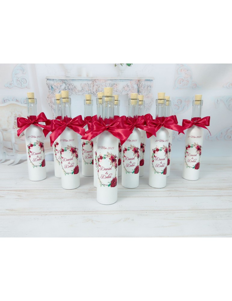 * Pretul este pentru o singura sticluta si include personalizarea cu: tematica aleasa, numele mirilor si data evenimentului.