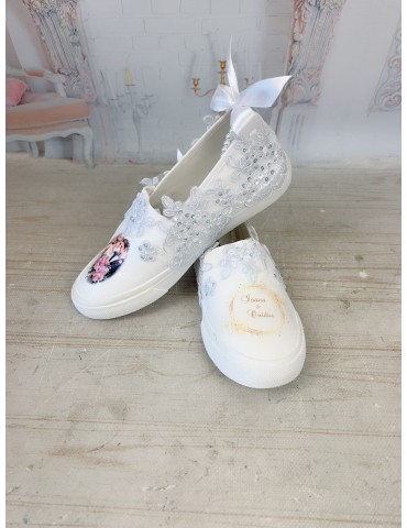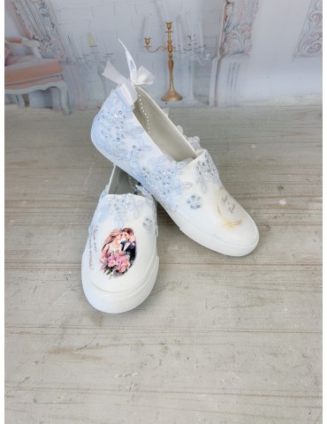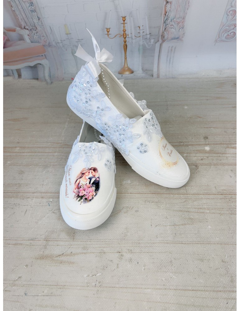 Pretul este pentru o singura pereche de tenisi si include personalizarea cu numele mirilor, data evenimentului si citatul preferat.