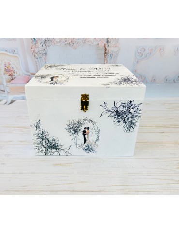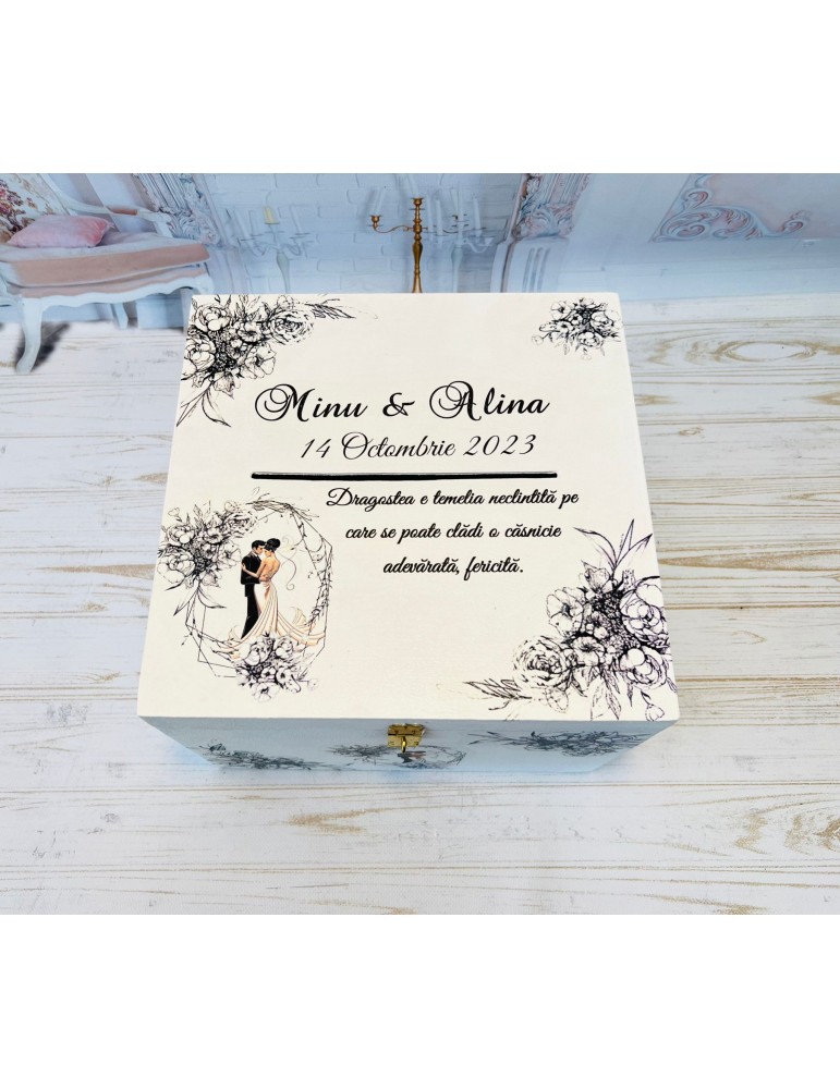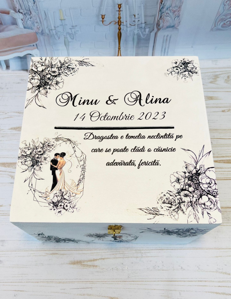 Pretul afisat se refera la o singura cutie de dar pentru nunta si include personalizarea (inlocuire nume miri, data eveniment si mesaj preferat).