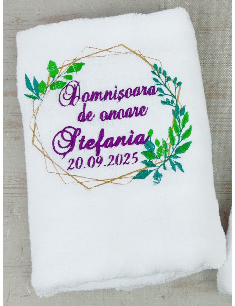 Răsplătește sprijinul și emoțiile împărtășite alături de domnișoarele tale de onoare cu un prosop din bumbac 100% personalizat prin broderie cu numele lor și data nunții. Acest cadou elegant și util le va aminti mereu de ziua voastră specială și de rolul important pe care l-au avut în povestea voastră.