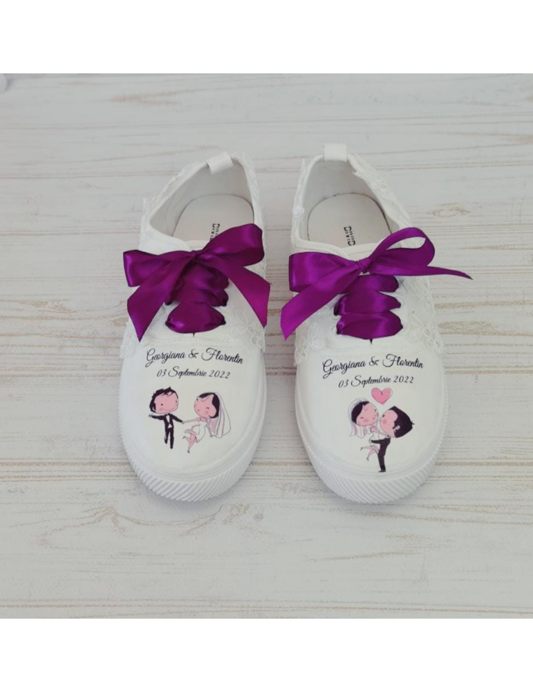 Pretul este pentru o singura pereche de tenisi si include personalizarea cu numele mirilor, data evenimentului si citatul preferat.