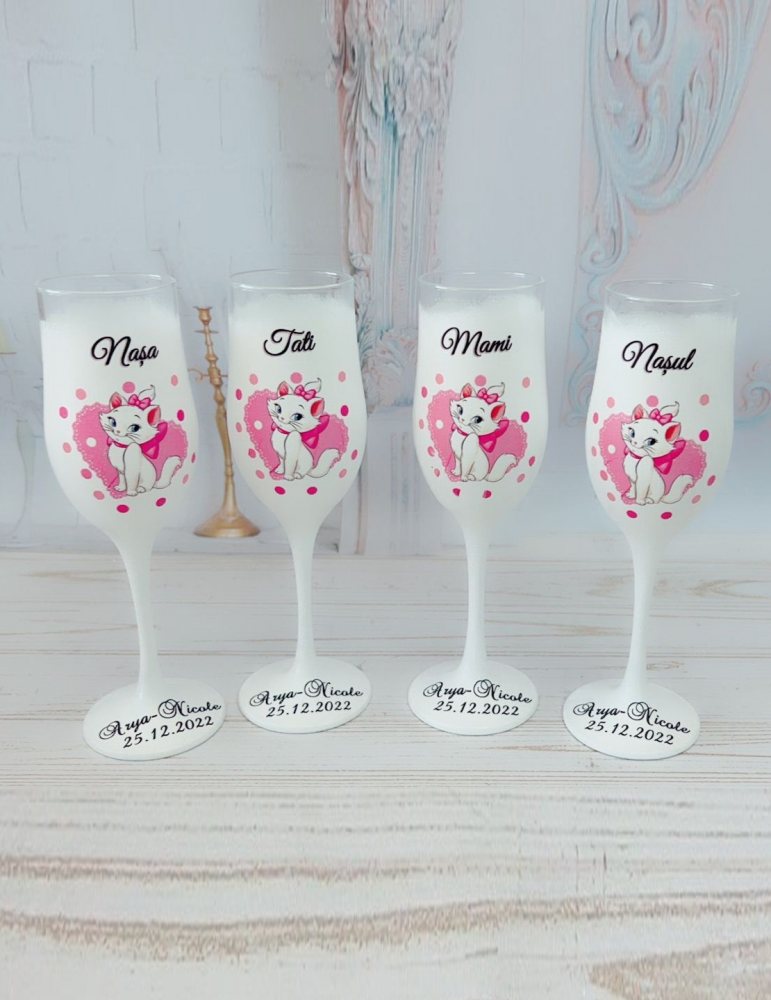 Pahare de botez personalizate pentru parinti si nasi cu pisica aristocrata