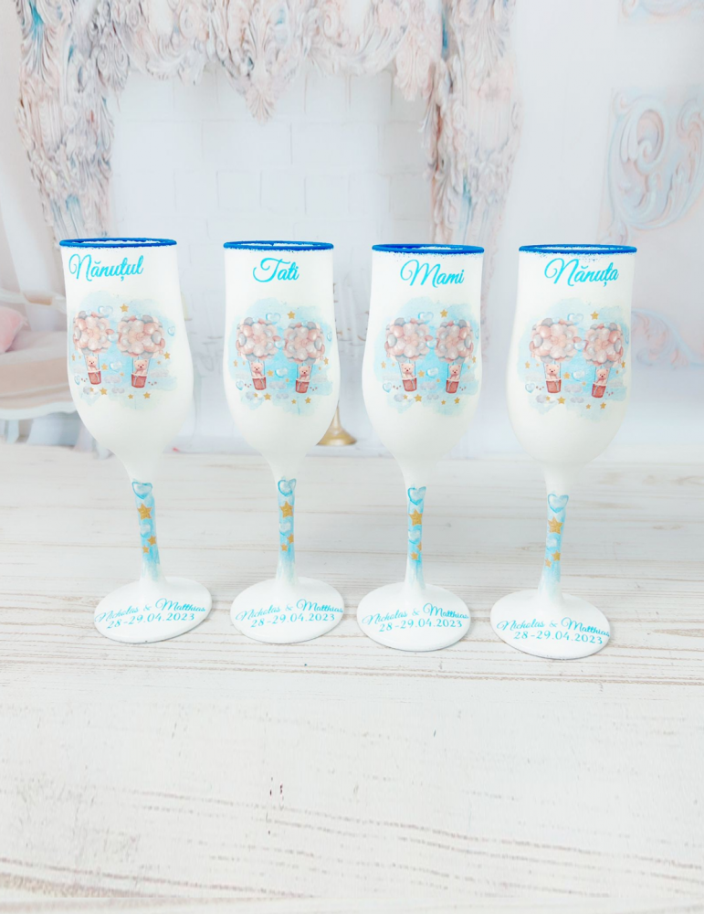 Transforma momentul special al botezului intr-o amintire de neuitat cu pahare de botez personalizate, realizate cu rabdare, atentie si pasiune! Fiecare pahar este lucrat manual prin tehnica decoupage, folosind produse NON TOXICE, rezistente la spalare repetata. Modelele unice sunt adaptate tematicii evenimentului tau, oferind o nota de rafinament si stil.