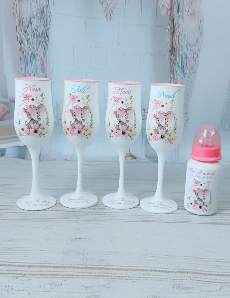 Pahare de botez personalizate pentru parinti si nasi cu elefant