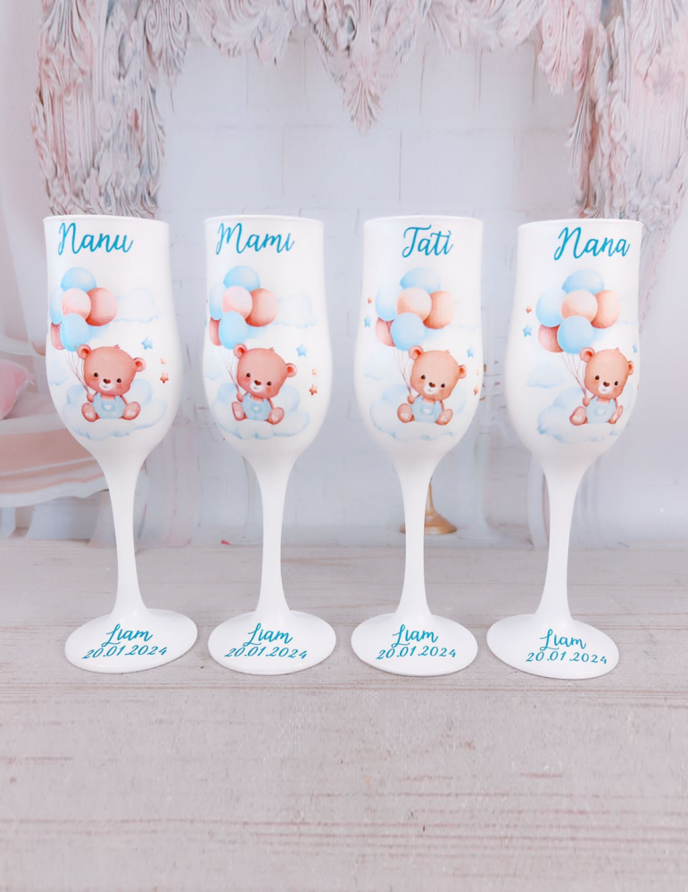 Pahare de botez personalizate pentru parinti si nasi cu ursulet